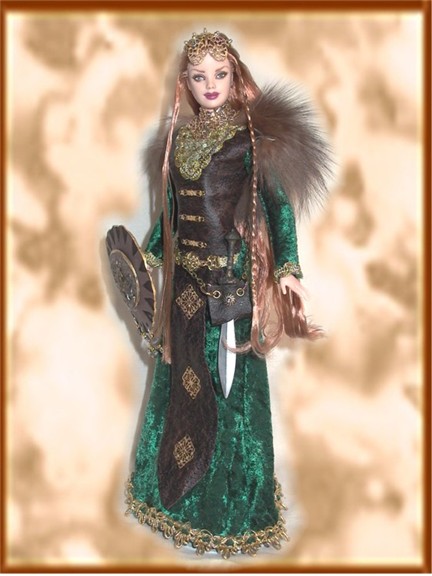 My interpretation of the Goddess Freya of Norse mythology. Inspiration for this design was taken from several photos of the Freya that my client found online. I compiled elements of both photos to come up with this concept. Green was his choice of color for the dress. The shield and faux leather armor are my own concept and design. This doll was a unique challenge and a joy to make. I sewed two other prototypes of the dress before choosing this one. I thank him for the opportunity to create this unique doll.
